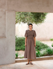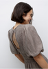 Long dress. Gathered bodice. Tie-up straps and opening at the upper back. Round neckline. Short puffed sleeves.