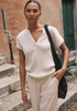 Straight-leg trousers with a soft textured finish, featuring a drawstring waist and relaxed silhouette. Effortless styling, full length, and clean lines define this wardrobe staple.