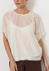The Phoebe Appliqué Flower Top in Ivory is crafted from delicate embroidered floral lace and comes with a separate camisole for coverage. It features a round neckline, dropped shoulders, and a button and loop closure at the back.