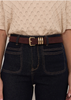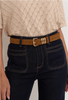 The Kory Suede Jeans Belt features a plated metal buckle with a fixed metal keeper and an adjustable faux suede belt keeper. Crafted from bonded suede leather with plated metal detailing.